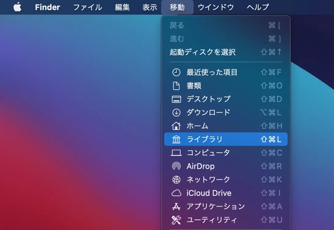 ②Finder のメニューバーから「移動」→「ライブラリ」を選択