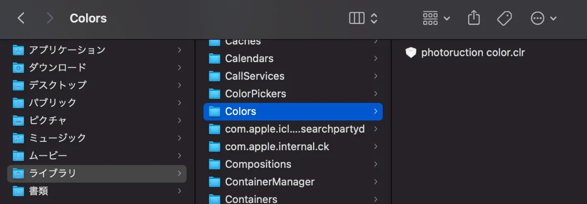 ③「ライブラリ」フォルダ内にある「Colors」フォルダの中に「photoruction color.clr」を格納